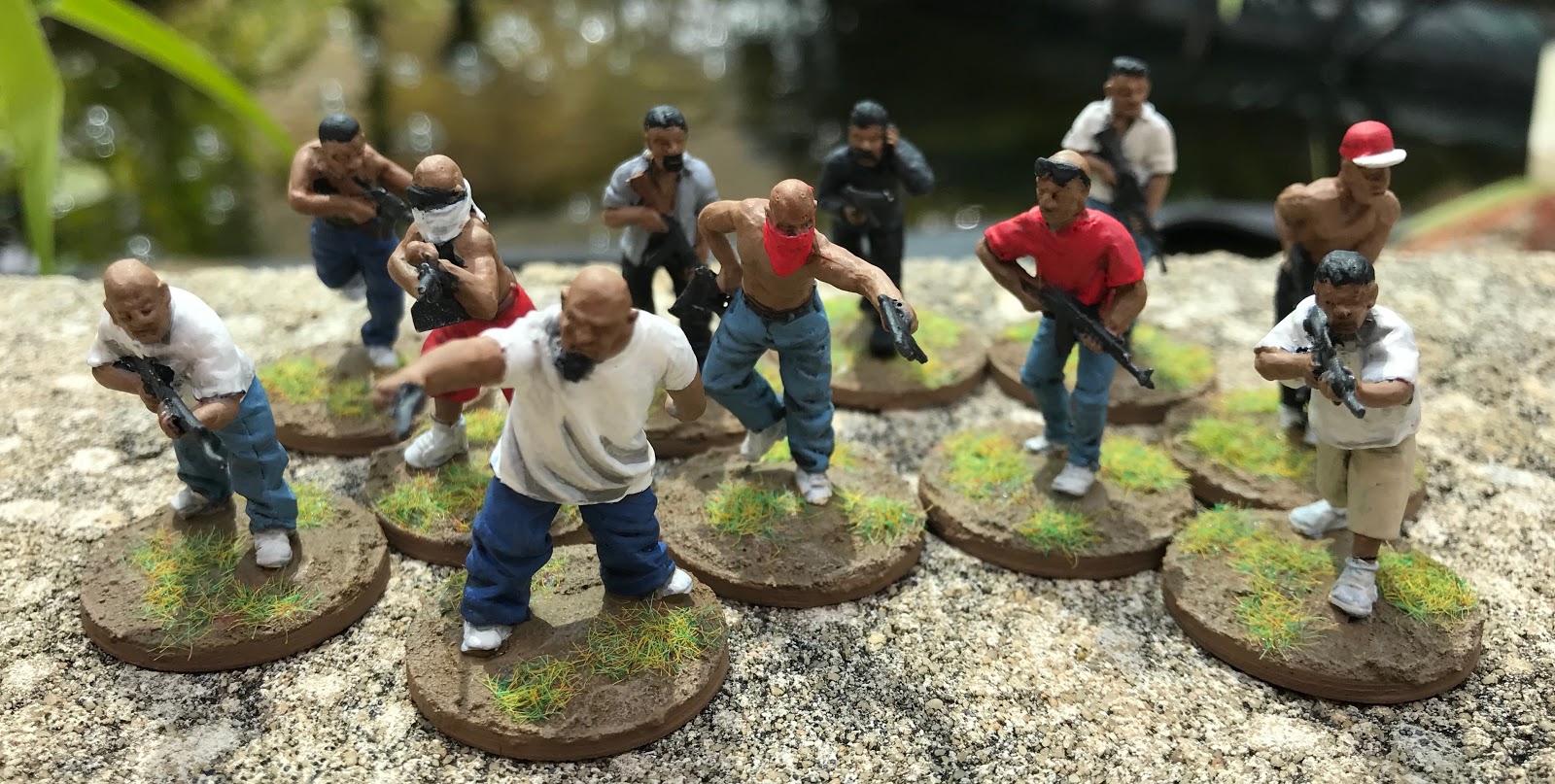 The feared El Taco Cartel homies are kicking it Southside, plotting and scheming on ways to get product across or under the border. Figures are 28mm Spectre Miniatures.